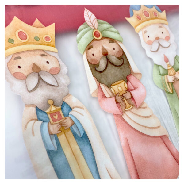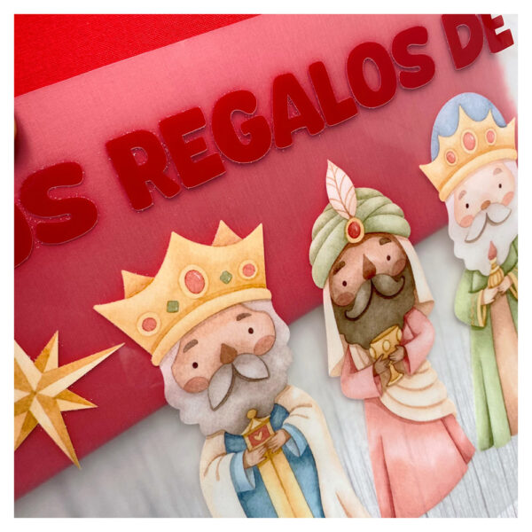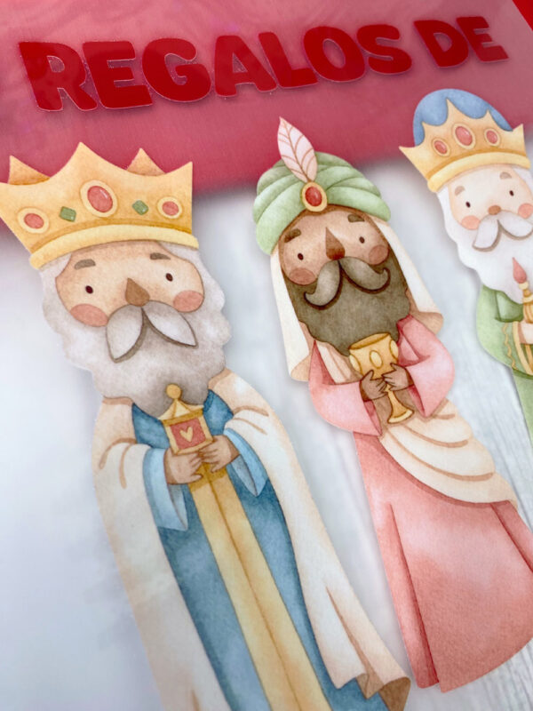 Este transfer DTF incluye la ilustración acuarelada de los tres Reyes Magos con su estrella y el texto “Los regalos de…”, listo para personalizar según tus necesidades.