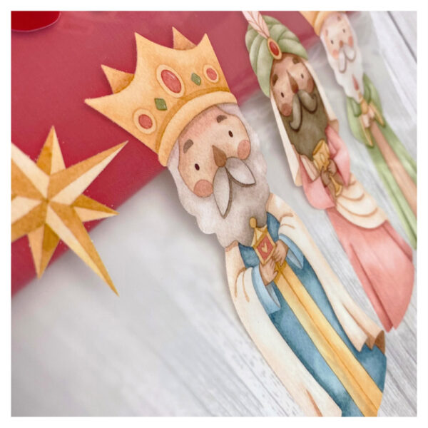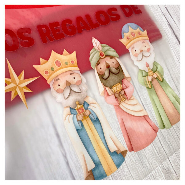 Un diseño DTF lleno de encanto navideño, con los tres Reyes Magos y su Estrella, perfecto para personalizar tus sacos de regalos con un toque dulce, artesanal y muy especial. Añade el nombre que quieras y convierte cada detalle en pura Magia de Reyes.