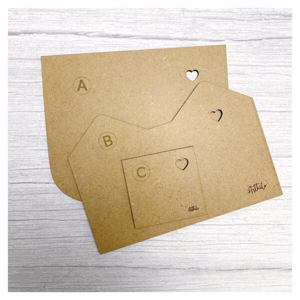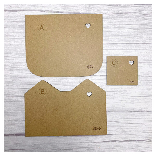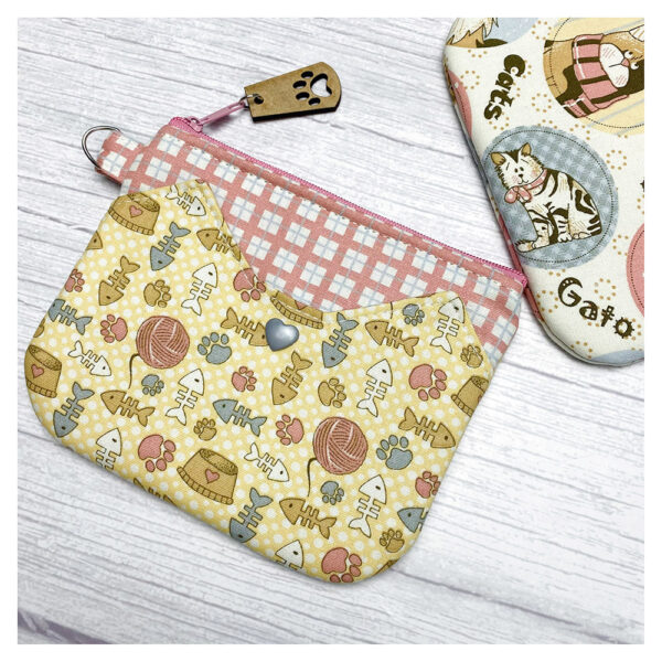 Patrón en MDF compuesto por 3 piezas para confeccionar un monedero con bolsillo exterior en forma de orejas de gato.