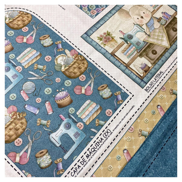 Panel 100% algodón premium con impresión digital de una dulce ratona costurera. Incluye el patrón impreso listo para coser tu propia funda de máquina.