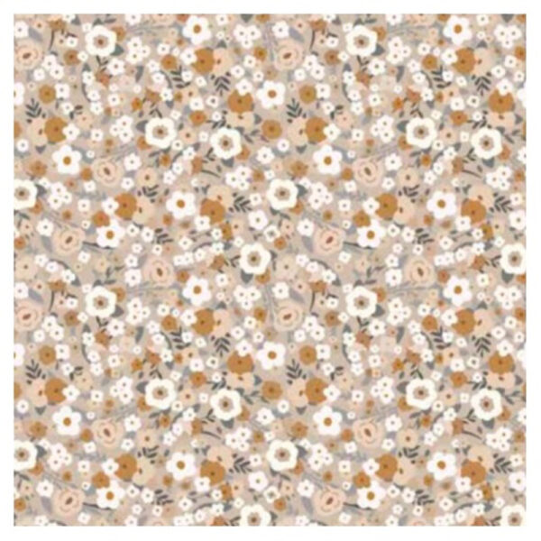 Este percal de algodón 100% es uno de esos tejidos de toda la vida, conocido por su tacto suave y su sensación fresca. Es ligero, firme y de gran calidad. Su estampado digital con pequeñas flores en tonos marrones, blancos y beige crea un diseño dulce y armonioso, perfecto para proyectos con un aire romántico y natural.