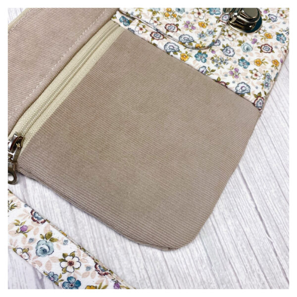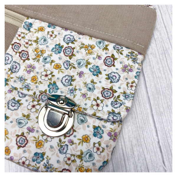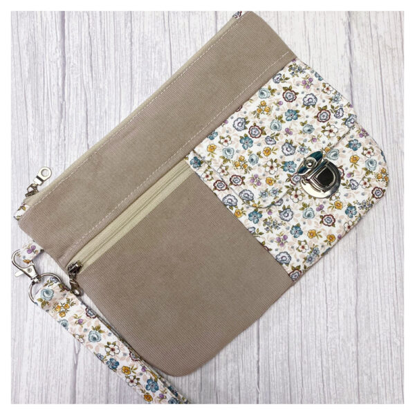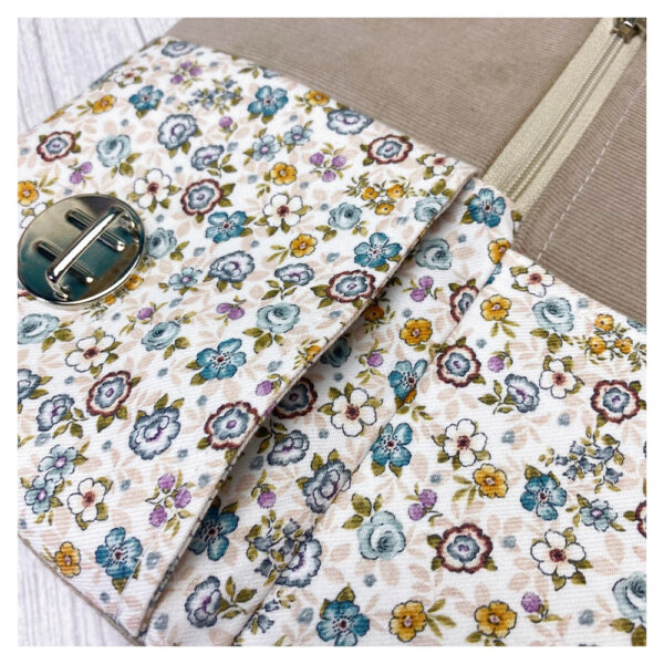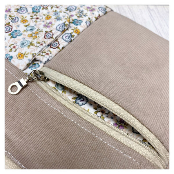 La maxi cartera cuenta con dos bolsillos exteriores —uno con cremallera y otro con solapa de cierre—, además de un compartimento principal amplio donde podrás guardar objetos más grandes como el móvil, el monedero o las llaves. Su diseño combina practicidad con acabados profesionales, gracias a las técnicas de confección que aprenderás paso a paso.